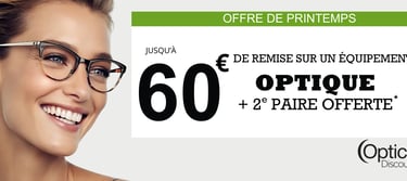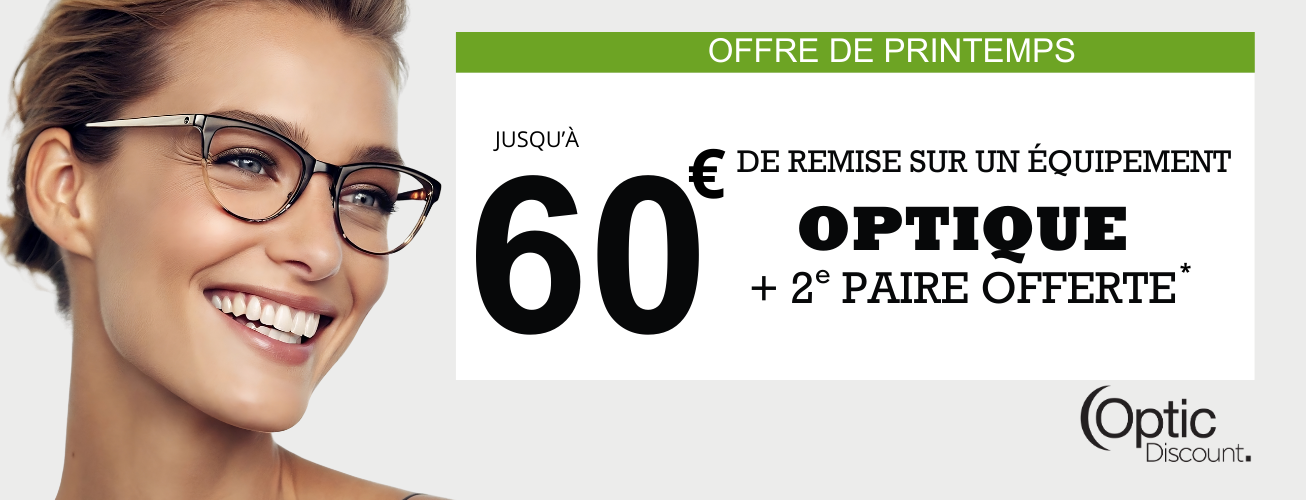 *Offre valable pour l’achat d’un équipement optique complet comprenant une monture et deux verres correcteurs. Remise de 60 € applicable sur un équipement avec verres progressifs pour un montant minimum de 490 €, ou remise de 30 € applicable sur un équipement avec verres unifocaux pour un montant minimum de 300 €. Une 2ᵉ paire est offerte parmi une sélection dédiée ; la monture est à choisir dans la collection « Seconde Paire » (prix public conseillé maximum 40 €). Elle est équipée de verres de même correction que le 1er équipement, uniquement pour des corrections de –4 à +4 (cylindre 2), en verres organiques CR39 blancs unifocaux indice 1.5 ou en verres progressifs CR39 blancs indice 1.5, hors options. Offre valable pour une seule et même personne, sur présentation d’une ordonnance en cours de validité, du 15 mars au 30 avril 2026 chez Optic Discount Fayet. Offre non cumulable avec d’autres promotions, avantages CE ou remises mutuelles. Les remises mutuelles éventuelles seront déduites en priorité ; les remises globales (mutuelles + offre) ne pourront excéder 60 € pour un équipement progressif (min. 490 €) et 30 € pour un équipement unifocal (min. 300 €). Ne peut servir à payer un acompte. Les lunettes correctrices sont des dispositifs médicaux portant le marquage CE. Demandez conseil à votre opticien. Image d'illustration – Non contractuelle. A.F.F.A.J., 11 rue du Gouvernement, 02100 Saint-Quentin – RCS 482 396 454.